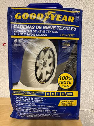 Cadenas de nieve textiles Goodyear Ultra Grip. Incluye 2 unidades y guantes. - Producto patentado. - Rápido y fácil de instalar. - Silenciosas y no vibran. - No deterioran el neumático. - Uso solo en carretera con nieve o hielo. - Talla L (puedes ver las medidas de neumatico compatible en la 2ª foto)