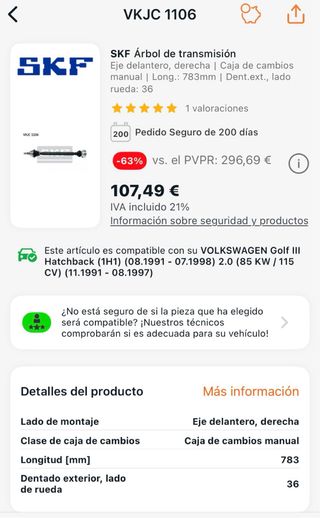 Palier lado derecho Golf 3/Vento