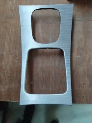 Marco embellecedor para la palanca de cambios de un Mercedes-Benz W203. Presenta un acabado plateado con un diseño texturizado. - Diseño con líneas finas. - Dos aberturas para la palanca y consola.