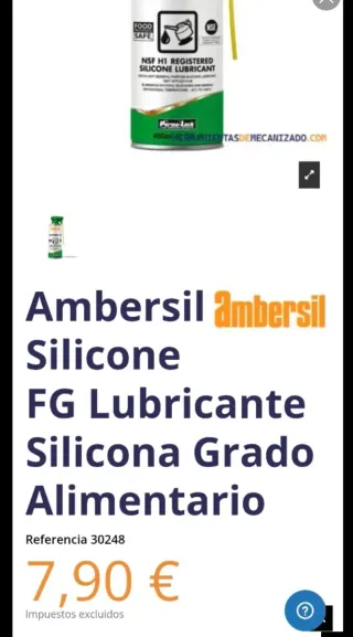Lubricante de silicona Ambersil, grado alimentario. Caja 12 unidades 40€ -Muy aconsejable para desmoldar -Uso adecuado en material de pesca y armas ya q su composición no daña los barnices ni plásticos. - NSF H1 Registered Silicone Lubricant. - Formato 400ml. - Referencia 30248.