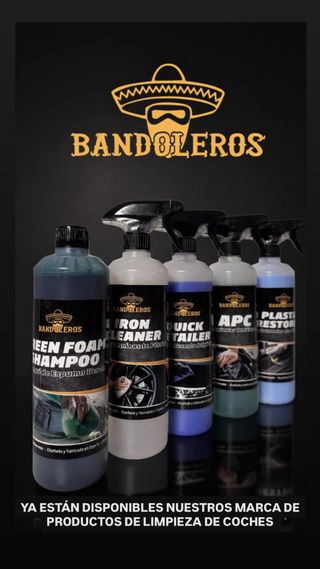 Kit de productos de limpieza para coches de la marca Bandoleros. Incluye varios artículos para el detallado. - Green Foam Shampoo - Iron Cleaner - Quick Detailer - APC - Plastic Restorer Al precio del pack hay que sumarle el precio del envio