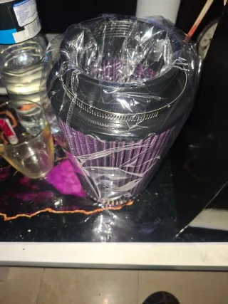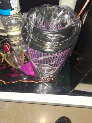 Filtro de aire para coche con un llamativo color morado. Se encuentra en su embalaje original. - Cono de filtro de aire. - Abrazadera metálica incluida.