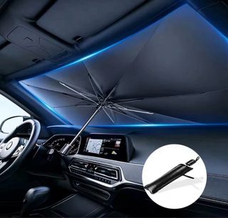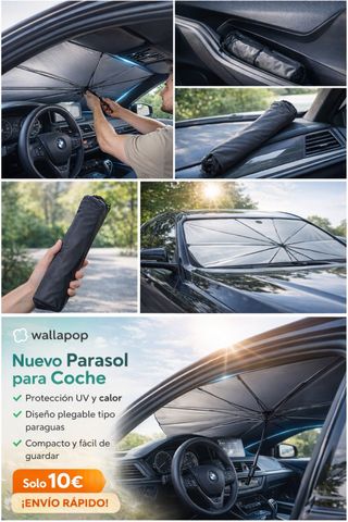 Parasol plegable para coche, diseñado para proteger del sol y el calor. Su formato tipo paraguas facilita su uso y almacenamiento. - Protección UV y calor. - Diseño plegable tipo paraguas. - Compacto y fácil de guardar.