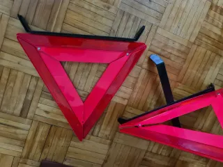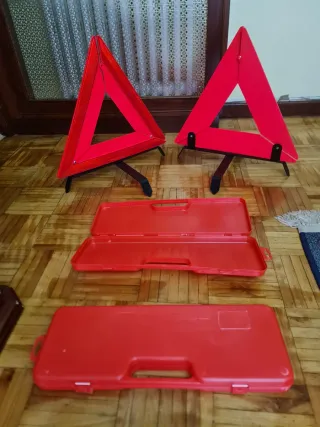 Set de dos triángulos de señalización para coche, perfectos para emergencias en carretera. Incluyen su estuche para guardarlos. - Dos triángulos de señalización. - Estuche de plástico rojo. - Una de las pestañas de cierre de uno de los estuches está rota.