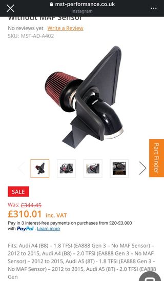 Kit de admisión MST Performance. Diseñado para optimizar el flujo de aire. - Filtro de aire cónico de alto flujo. - Caja de admisión diseñada a medida. Valido para Audi A4/A5, motor 1.8/2.0, desde 2013-2015 (b8.5) Incluye admision y filtro, tiene 2.000km de uso por lo que el filtro esta nuevo, listo para montar. Tiene un sonido espectacular incluso sin montar válvula de descarga. Me costó 440€ ya que viene de Reino Unido y si la compras hay que pagar 80€ de aduanas mas los 360€ que vale.