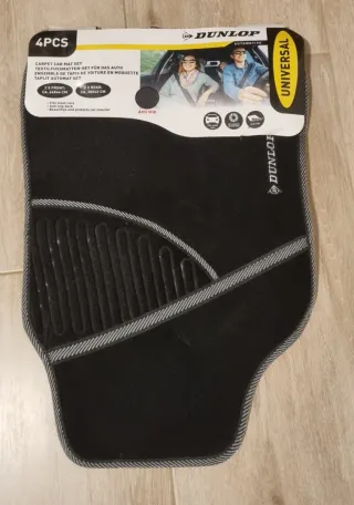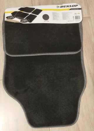 Juego de 4 alfombrillas textiles para coche de la marca Dunlop. - 2 alfombrillas delanteras: 66x44 cm. - 2 alfombrillas traseras: 28x42 cm. - Diseño universal. - Base antideslizante. - Embellecen y protegen el interior del coche.