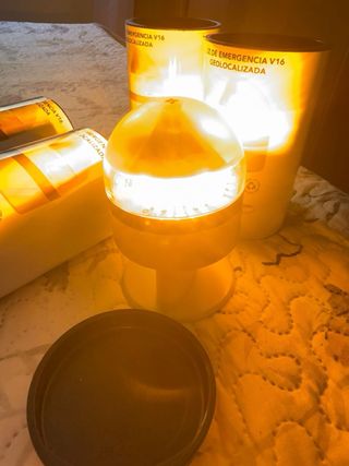 Se venden dos balizas V16. - Diseño compacto y moderno. - Base negra con detalles naranjas. - Parte superior transparente con logo naranja.