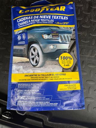 Cadenas de nieve textiles Goodyear, modelo Ultra Grip. Incluye 2 unidades. - Talla S. - Rápido y fácil de instalar. - Silenciosas, no vibran. - No deterioran el neumático. - Uso en carretera con nieve o hielo. - Incluye guantes.