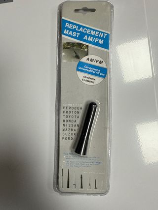 Antena de repuesto para radio AM/FM de coche. Es un elemento universal compatible con la mayoría de los vehículos. - Diseño elegante y compacto. - Incluye dos tipos de fijación (M5xM6) para adaptarse a diferentes modelos. - Fabricada con materiales de alta calidad.
