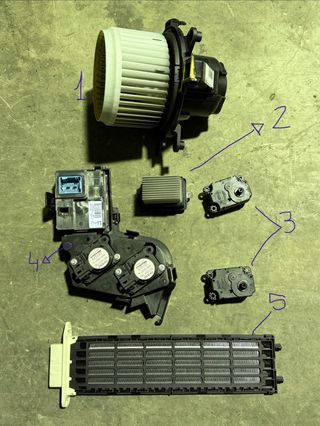- 1: motor activador ventiladores calefacción Ref: 5P1300000 5P1330400 (45€) - 2: resistencia calentamiento ventilador Ref: 12V A.430.029.00 (40€) - 3: motores trampilla apertura aire calefacción Ref: A21201700 (20€ unidad) - 4: módulo calefaccion con soporte y dos motores Ref: 5P1324900 9836666580 E1065901C (70€) - 5: resistencia calefacción Ref: A.521.036.00 PBT-GF30 (25€) Preguntar si solo se quiere algunas piezas Se hace envío Citroen berlingo, Peugeot partner, peugeot rifter, Opel combo, Fiat doblo, Toyota proace