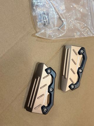 Reposapiés para motocicleta, diseñados para los modelos CF800 y 800NK de 2023-24. Fabricados en aluminio con un acabado en color bronce y detalles en negro. - Diseño moderno y robusto. - Piezas de alta calidad.