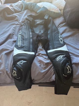 Pantalones de moto de cuero de la marca Alpinestars. - Color negro con detalles blancos. - deslizaderas integradas en rodillas. - Cremalleras en los tobillos. No leer: Mono alpinestar mono 2 piezas moto cuero protecciones