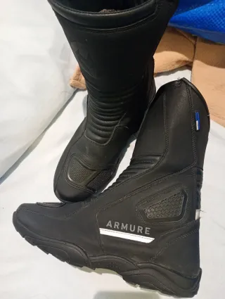 Botas de moto de la marca Armure, modelo Mack. - Talla 42. - Diseño impermeable. - Cierre de cremallera y velcro. - Protecciones en tobillo y espinilla. - Suela antideslizante.