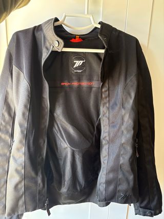 Chaqueta de moto de la marca Scott, con un diseño deportivo y llamativo. - Combinación de colores negro, blanco y detalles en rojo. - Cierre frontal con cremallera. - Cuello alto con cierre de botón. - Paneles de ventilación en las mangas, hombros y espalda. - Protecciones en hombros y codos. - Ningún roce ni caída.