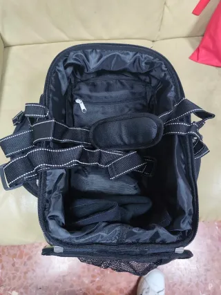 Mochila para depósito de moto en color negro. Cuenta con varios compartimentos para organizar tus pertenencias. - Material textil resistente. - Cintas de sujeción ajustables. - Bolsillo interior con cremallera. - Asa acolchada para un transporte cómodo.
