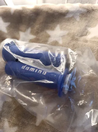 Par de puños de moto de la marca Domino en color azul con las letras en blanco. Son nuevos a estrenar, para manillar y simimanillares de 22/24mm. Hago envíos por wallapop.