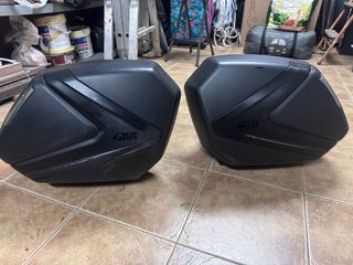 Maletas laterales para moto de la marca Givi. Diseño moderno y funcional. - Color negro mate. - Acabado con detalles en imitación carbono. - Bolsas interiores originales de regalo. - Maleta derecha con una leve rozadura.