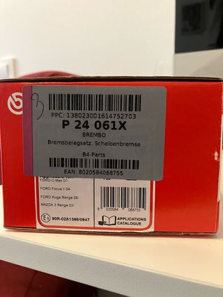 Pastillas de freno Brembo P 24 061X, nuevas a estrenar. - Referencia: P 24 061X - Marca: Brembo - Tipo: Bremsbelagsatz, Scheibenbremse - EAN: 8020584068755 - Aplicable a: FORD C-Max 07-, FORD Focus II 04-, FORD Kuga Range 08-, MAZDA 3 Range 03- - Homologación: E9 90R-02A1398/0947