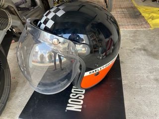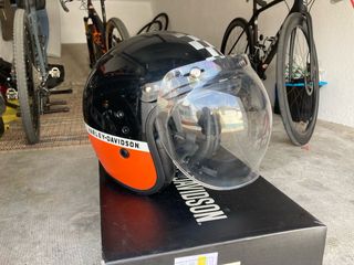 Casco Harley Davidson, talla M, en perfecto estado. - Diseño vintage con franja naranja y detalles en blanco y negro. - Incluye pantalla transparente. - Se entrega en su caja original.