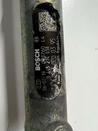 Rampa de gasóleo para Mercedes Viano. Pieza metálica de color gris. - Conexiones roscadas. - Soporte lateral. -Sin los sensores.