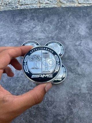 Set de 4 tapabujes nuevos para llantas Mercedes AMG de 75mm. - Color: Plata. - Diseño: Emblema AMG con árbol y Affalterbach. - Material: Metal y plástico de alta calidad.