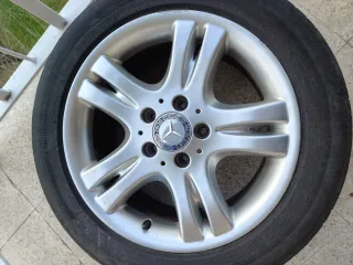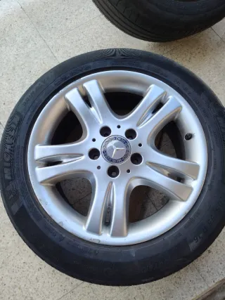 Se venden llantas originales mercedes con neumático (1 mal estado por pinchazo)montadas en un clase C (w203) - Marca de neumáticos: Michelin Primacy 4. - Medida del neumático: 205/55 R16. - Diseño de llanta de aleación plateada con 5 radios dobles. - Llanta r16 et37 7jx16 h2 5x112