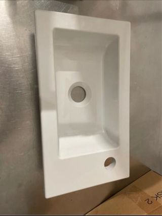 Lavabo compacto de diseño moderno, ideal para espacios reducidos como campers o furgonetas. - Fabricado en material resistente y fácil de limpiar. - Incluye orificio para desagüe y otro para grifería.