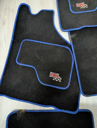 Juego de cuatro alfombrillas para Mini clásico. Diseñadas para un ajuste perfecto y con un acabado de calidad. - Color negro con ribete azul. - Incluyen emblema de Union Jack. # mini authi BMC morris 1300 1000 850 1275 Cooper s clásico bisagras sportpack Rover