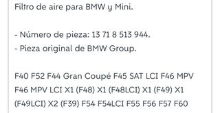 Filtro de aire genuino para vehículos BMW y MINI. - Número de pieza: 13 71 8 513 944 - Fabricado en Alemania (DE)