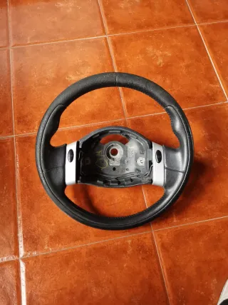 Volante deportivo para Mini Cooper S modelo R53. Diseño ergonómico para un mejor agarre. Cuero algo desgastado. - Material: Cuero. - Color: Negro. - Acabado: Piel perforada.