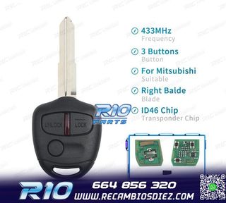 Móvil: 664 856 320 - Referencia: RLC010050. Llaves para Mitsubishi Botones: 3 botones Frecuencia: 433 mhz Nota: ID ID46 Válido para: Mitsubishi Lancer / Outlander / Shogun / Pajero Incluye: 1 Llaves de 3 botones 1 placa de circuito IMPORTANTE: Para evitar confusiones en tu pedido comprueba en las fotos que el espadín y el interior de la carcasa coincida con tu modeloEstos no son productos originales de la marca MITSUBISHI.El artículo ofrecido, solo es compatible para los modelos de vehículos descritos.