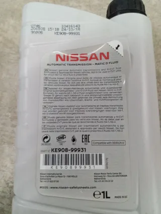 Fluido para transmisión automática AT-Matic D de Nissan. - Capacidad: 1 Litro. - Código: KE908-99931. 15€ bote. Los dos 25€