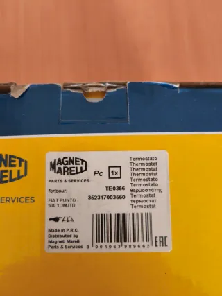 Termostato de la marca Magneti Marelli. - Referencia: TE0356 - Número de pieza: 352317003560 - Compatible con Fiat Punto 500 1.3MJTD - Fabricado en P.R.C. Nuevo sin uso ,se compró y ese no era el problema de mi coche