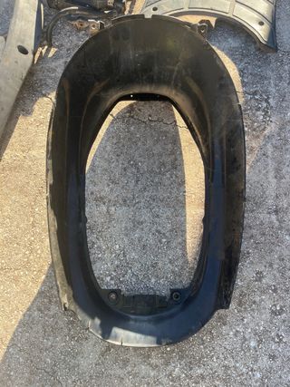 Se vende conjunto de carcasas para Piaggio Zip Copa MK1. No se vende nada por separado, SOLO EL LOTE. Incluye lo que se ve en fotos. Suelo, laterales, bañera, faro y radiador. - Piezas de plástico negro. - Incluye frontal, suelo, guardabarros y otras partes. - Marca Piaggio visible en una de las piezas.