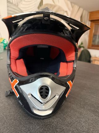 Casco de moto o quad para niño, talla M. Diseño deportivo con detalles en naranja y negro. - Cierre de seguridad. - Visera. - Interior acolchado.