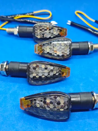 Pack de cuatro intermitentes LED universales para moto o quads homologados. Diseño moderno y compacto con carcasa ahumada . "MAS MODELOS EN MI PERFIL" - Carcasa negra. - Luz ámbar. - Conexión de dos cables. 🎁De regalo luz de matricula homologada🎁