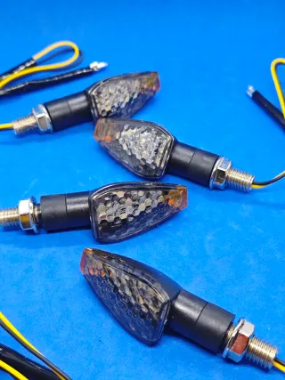 Se venden cuatro intermitentes LED para motocicleta. Son de color negro y tienen un diseño elegante y moderno. - Incluye 4 intermitentes. - Conexión mediante cableado. - Acabado en color negro oscuro..