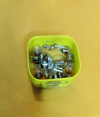 Caja original de bombillas de la marca HAYE para el SEAT 600. - Caja de plástico de color amarillo. - Incluye el texto LAMPARAS HAYE y REPUESTO SEAT 600-E.