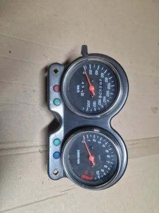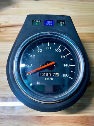 Cuadro de instrumentos para Suzuki GS 500. - Velocímetro hasta 200 km/h. - Tacómetro hasta 10000 rpm. - Indicador de kilometraje: 4536 km. - Luces indicadoras.
