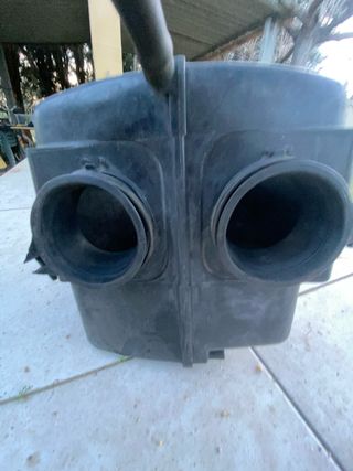 Caja de filtro de aire para motocicleta Suzuki GS500. - Pieza de plástico negro. - Dos entradas circulares. - Tubo de conexión superior.