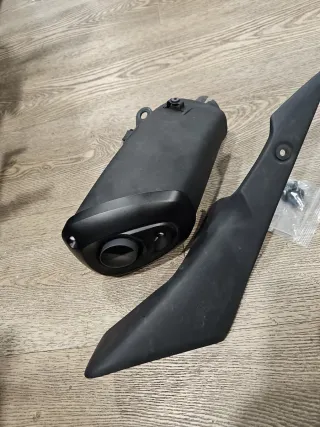 Se vende escape de moto en color negro. Incluye una pieza de plástico negro y tornillos. - Escape de moto negro. - Pieza de plástico negro. - Tornillos.