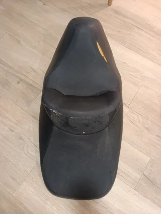 Asiento para Suzuki Burgman 650. Presenta un diseño ergonómico para mayor comodidad. La gomaespuma está en buen estado, pero como veis, hay algunos agujeritos del uso. Ideal para alguien que sepa tapizarlo o parchearlo. - Tapicería negra. - Desgaste visible en la zona delantera.