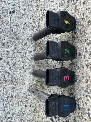 Juego de cuatro bobinas de encendido para Volkswagen 2.0 TSI. Piezas de repuesto para el motor. Se quitaron hace 5 años de un Scirocco con 90.000 kms. - Compatibles con motores 2.0 TSI. - Fabricadas en plástico negro y metal. #Volswagen #GolfGTI