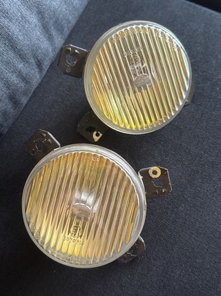 Par de faros antiniebla amarillos de la marca Hella, compatibles con Volkswagen Polo. - Lente de cristal con patrón acanalado. - Carcasa metálica. - Soportes de montaje incluidos.