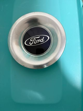 Tapacubos para llanta de Ford. - Diseño plateado con logo Ford en negro y blanco.