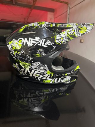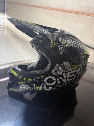 Casco de motocross O'Neal con un diseño llamativo y moderno. - Diseño gráfico en negro y verde neón. - Visera integrada. - Cierre de seguridad.