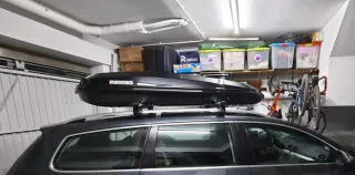 Cofre de techo Menabo de 450 litros de capacidad. Apertura por ambos lados con cierre centralizado de seguridad. Cierra perfectamente y da sensación de mucha seguridad. El diseño es muy aerodinámico y ofrece muy poca resistencia con lo que el consumo del vehículo apenas aumenta. Esta fabricado en ABS y se nota la calidad y robustez del cofre. Medidas exteriores (largo x ancho x alto): 163 x 90,7 x 36 cm. Medidas interiores (largo x ancho x alto): 159 x 86,5 x 33,4 cm. Peso máximo de 75 kg. Peso del cofre 20 kg. El sistema de amarre a las barras del vehículo es desde el interior del cofre compatible con la mayoría de barras.