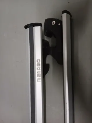Juego de barras de techo de aluminio de la marca MENABO. - Diseño aerodinámico. - Acabado en color plata. - Incluye soportes de fijación. Vehiculos con techo tipo railing.