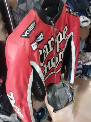 Chaqueta de moto de cuero roja y negra con diseño Carpe Diem. - Inscripción VORIEX en el hombro izquierdo. - Inscripción CHAMPION en el pecho izquierdo. - Inscripción MATCANO en el hombro derecho. - Cremallera frontal. - Detalles en blanco y negro en mangas y costados.