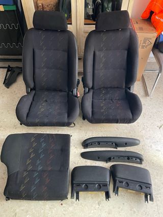 Conjunto de asientos delanteros y traseros para Peugeot 106 Rallye Fase 2. Tapicería negra con detalles de colores. Se venden tal cual se ven en las fotos, solo tengo lo de las fotos, no negociables.